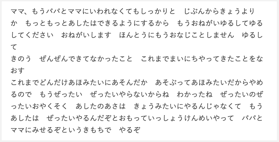 船戸結愛ちゃんは、朝4時に起き、「おねがい ゆるして」と覚えたてのひらがなで訴え、そして殺されていきました。