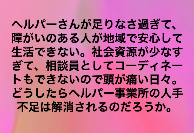 うちの部長や相談支援専門員のスタッフの一日を俯瞰すると、ヘルパーなどの「社会資源を探す労力」にかなりの時間を取られているのがわかります。
