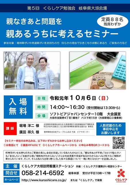 セミナー企画の目的と講師陣についてはチラシを参照いただくとして、このセミナーはくらしケア大垣訪問看護ステーションオープン記念講演でもありますので、西濃地区の皆さまにおかれましては、ぜひぜひ大垣のスタッフに会いに来てくださるとうれしいです。